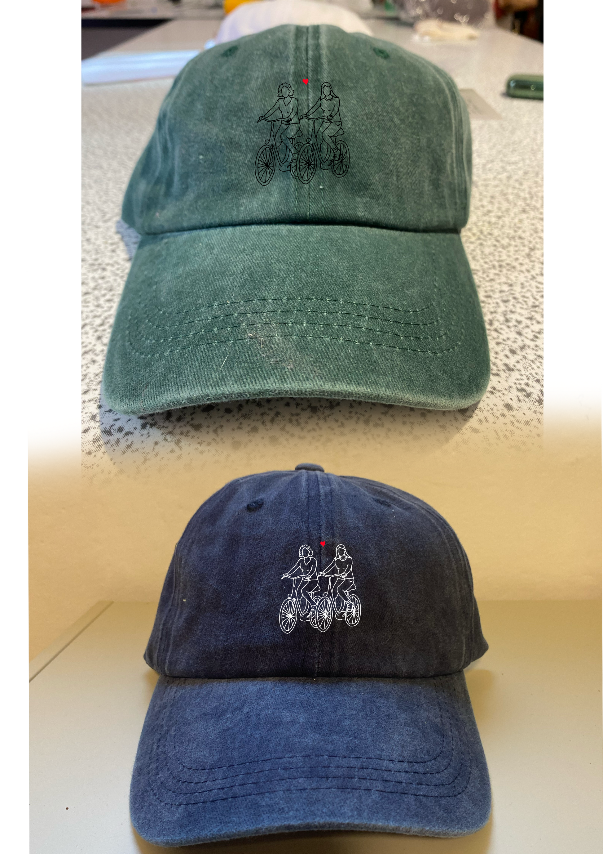 2 cappellini con visiera, taglia unica, colori Blu Navy e Verde. Con ricamo personalizzato come da accordi.